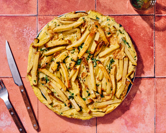 Un grand classique : omelette aux œufs garnie de frites, parsemée de persil.