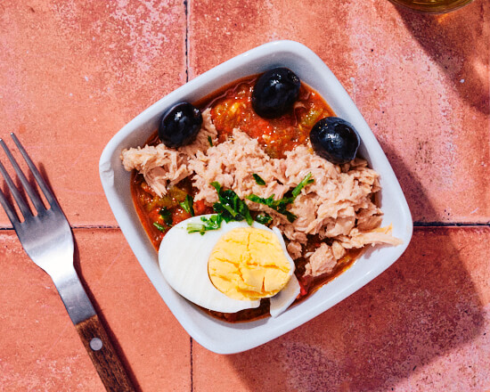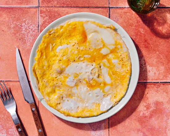 Omelette, olives noires et filet d’huile d’olive, servies avec fromage Vache qui rit, accompagnées d’un thé ou d’un café et d’un verre de jus d’orange.