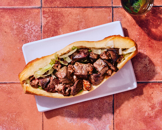 Un pain moelleux garni, foie grillé façon Tontons du Bled, frites et sauce au choix.