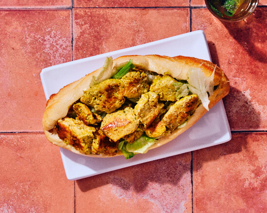 Un pain moelleux garni de poulet rôti à la maghrébine et sauce au choix. pour un plaisir simple et gourmand accompagné de frites.