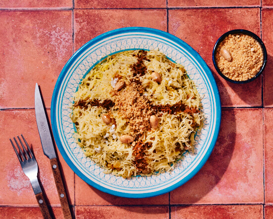 Plat marocain sucré-salé à base de cheveux d’ange vapeur, parfumés au beurre, cannelle et sucre glace, avec amandes grillées. Un classique doux et réconfortant.