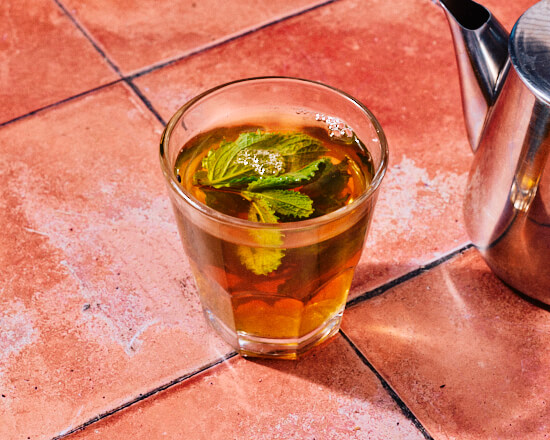 Omelette, msemen ou harcha (au choix : confiture, miel ou Nutella), olives noires, fromage Vache qui rit, accompagnés d’un thé ou café et d’un verre de jus d’orange.